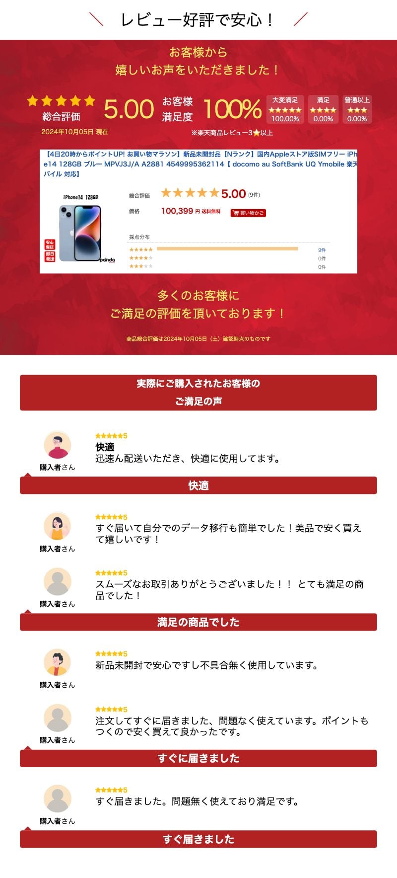 商品詳細 キャリアSIMフリー※日本国内Appleストア版 メーカーApple 型番iPhone14 128GB カラーブルー 利用制限 - ※利用制限判定について 判定は下記サイトに製造番号をご入力頂きご確認ください。 docomo / au / SoftBank / mineo UQmobile / Ymobile / 楽天モバイル 〇:ネットワーク利用制限の対象外です。(ただし、不正契約等が判明した場合は利用制限の対象となる可能性があります。) △:現状問題なく利用できますが、代金債務の不履行等により利用制限となる可能性があります。 ×:利用制限中(対象の回線での通信不可)です。 電気通信事業者(キャリア)より販売された携帯電話等は前所有者の利用状況や支払い状況に応じて端末の通信機能に制限がかかる可能性がございますため、 販売元キャリアのネットワーク利用制限確認サイトにてどのような表示が出ているかを記載しています。 付属品本体/外箱/USB-C - Lightningケーブル/SIMピン/マニュアル 商品ランクNランク バッテリー健康状態 100% <バッテリー健康状態について> フル充電後、一日一般的な使用をした場合の目安になります。 100:新品状態です。 100?80:新品同様で通常使用に問題がない状態です。 80?60:多少バッテリーが劣化しておりますが、日常使用に問題はありません。 60?40:バッテリーが劣化しており、日常使用に多少支障があります。 40?20:バッテリーが大幅に劣化しており、日常使用に大きく支障があります。 20?0:バッテリー交換をしないと通常使用が難しい状態です 商品状態新品未開封品です。 商品ランク説明 Nランク シュリンクラップやテープが付いている新品未開封品。 Sランク 初期保護フィルムなどが付いている通電動作確認のみの新古品 保証サービス等で本体交換後、未使用の新古品 Aランク 数回使用程度の新品同様品,外装,バッテリー状態が新品同様の中古品 Bランク 使用感の少ない中古美品,バッテリー消耗が少ない中古品 細かい擦り傷や塗装の剥がれ、小さい凹み傷1か所程度 Cランク 使用感の多少ある中古品 目立つ傷や擦り傷が数か所程度 大きめの落下傷1個程度 Dランク 細かいかけ傷複数 使用感のある中古品 目立つ傷や擦り傷が多数 大きめの落下傷が複数 この商品はNランクです。 発売日2022/9/16 OSiOS16 CPUA15 Bionic RAM- ストレージ128GB ディスプレイ6.1インチ メインカメラ1200万画素 サブカメラ1200万画素 重量172g バッテリー容量- SIMサイズnanoSIM/eSIM 関連商品【4日20時からポイントUP! お買い物マラソン】新品未開封品【Nラン...【4日20時からポイントUP! お買い物マラソン】新品未開封品【Nラン...100,399円99,899円【4日20時からポイントUP! お買い物マラソン】新品未開封品【Nラン...【4日20時からポイントUP! お買い物マラソン】新品未開封品【Nラン...119,199円119,199円【4日20時からポイントUP! お買い物マラソン】新品未開封品【Nラン...【4日20時からポイントUP! お買い物マラソン】新品未開封品【Nラン...99,399円97,799円【4日20時からポイントUP! お買い物マラソン】新品未開封品【Nラン...【ガラスフィルムプレゼント中!】【4日20時からポイントUP! お買い...112,899円70,269円